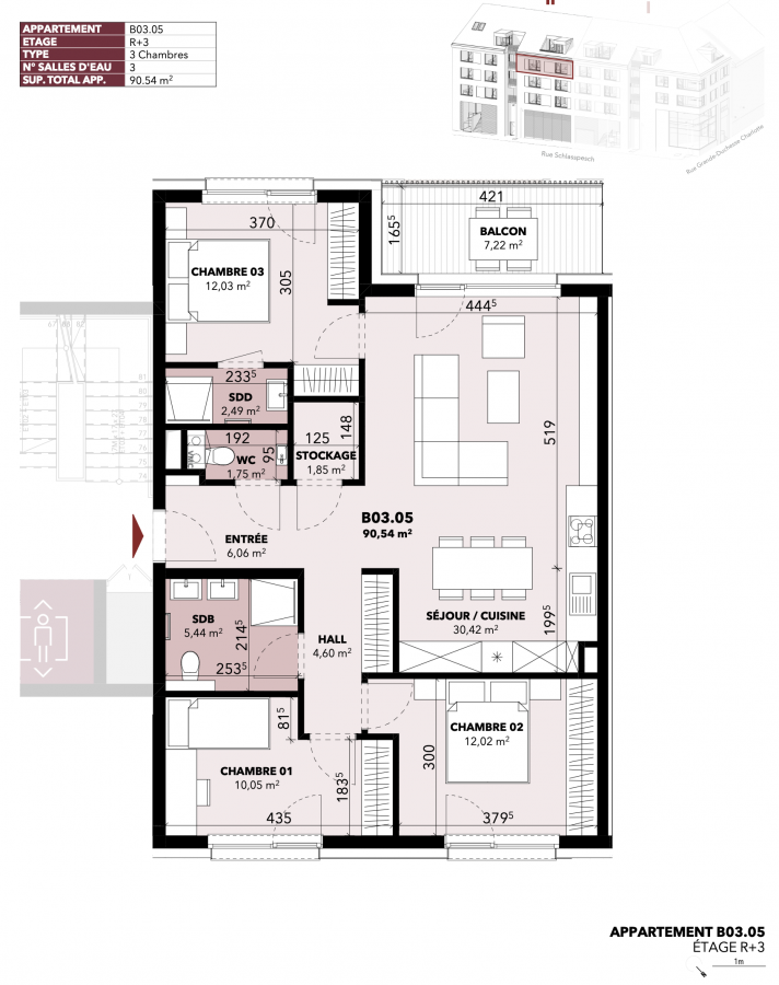 Neuf appartement 3 chambres avec balconSitué au 3? étage du bâtiment B de la nouvelle résidence « CHARLOTTE », ce spacieux appartement neuf (lot B 03-05) offre une surface habitable d'environ 90,54 m² ainsi qu'un agréable balcon de 7,22 m².