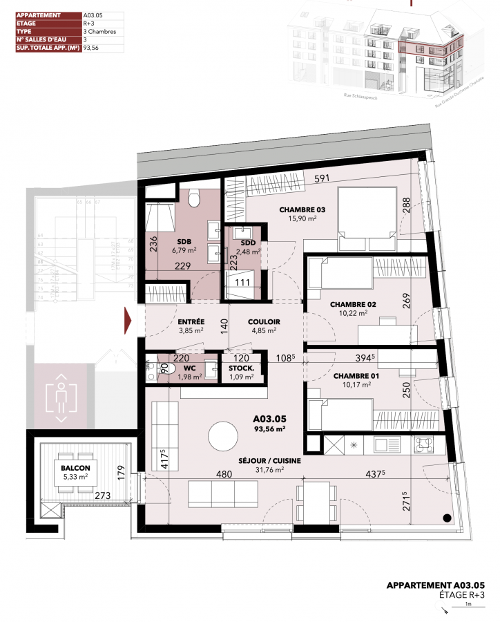 À vendre ? Spacieux appartement 3 chambres avec balcon ? Résidence « CHARLOTTE » à Mersch (Lot A 03-05)Dans le cadre moderne et élégant de la résidence "CHARLOTTE", découvrez ce magnifique appartement de ± 93,56 m², situé au 3? étage du bâtiment A. Il dispose d'un balcon de ± 5,33 m², apportant une belle luminosité à la pièce de vie.