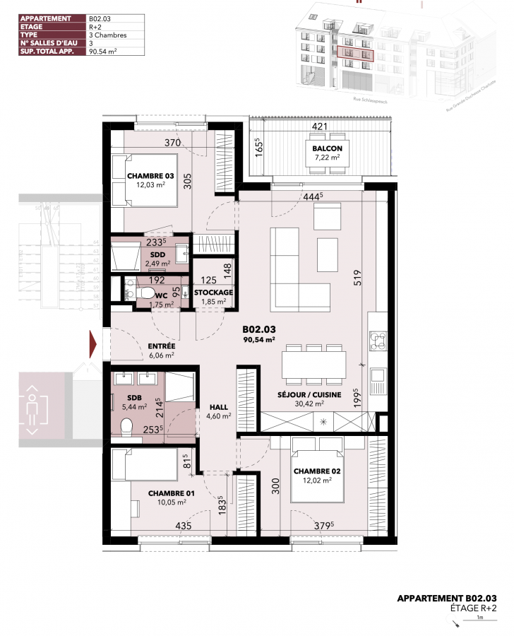 À vendre ? Appartement 3 chambres avec balcon ? Résidence neuve « CHARLOTTE » à Mersch (Lot B 02-03)Situé au 2? étage du bâtiment B de la nouvelle résidence « CHARLOTTE », cet appartement neuf de ± 90,54 m² offre de beaux volumes et une distribution fonctionnelle. Un balcon de ± 7,22 m² complète agréablement l'espace de vie, apportant lumière et ouverture sur l'extérieur.