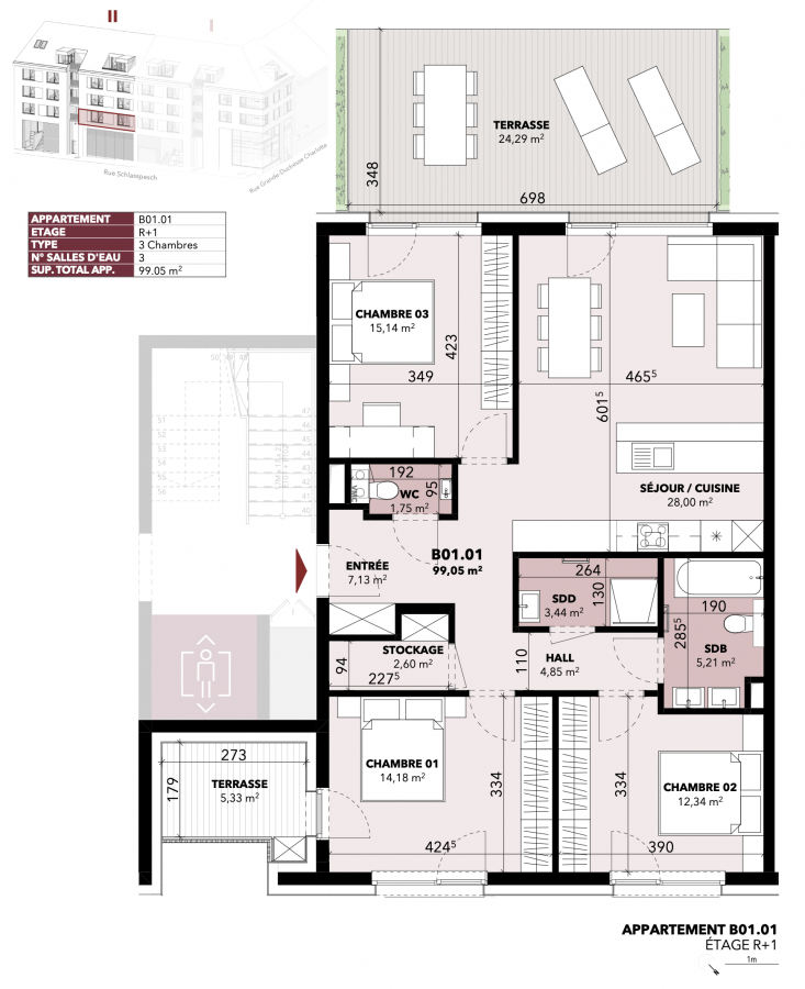 À vendre ? Appartement 3 chambres avec deux terrasses ? Résidence neuve « CHARLOTTE » à Mersch (Lot B 01-01)Ce bel appartement de ± 99,05 m² situé au 1er étage du bâtiment B de la résidence « CHARLOTTE » séduit par ses deux terrasses bien orientées de ± 24,29 m² et ± 5,33 m², offrant un confort de vie extérieur rare en centre-ville.