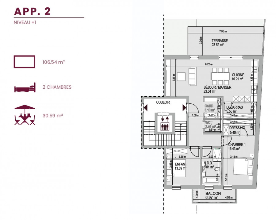 Appartement neuf : Lot N°2 de 2 chambres à coucher, situé au premier étage avec une surface habitable de 106,54 m2 et d' une surface totale de 137,43 m2.