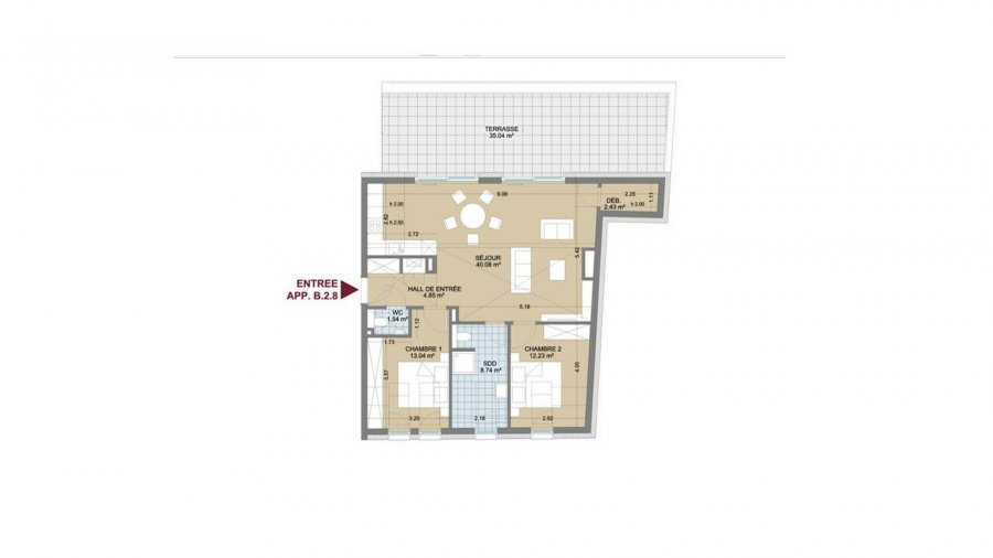 Nouvelle résidence ''SCHIEREN II'' composée de 15 appartements de haut standing répartis en 2 blocs de 4 niveaux et située à Schieren, au sein d'un village calme.Appartement n° B.2.8 (lot 057) neuf au 2ème étage du Bloc B avec une surface habitable de +/- 85,58 m2 se composant comme suit : d'un hall d'entrée, d'un WC séparé, de 2 chambres à coucher (+/- 12,23 m2 et 13,04 m2), d'une salle de bain (+/- 8,74 m2), d'une cuisine à équiper ouverte sur un vaste séjour de +/- 40,08 m2 avec accès à 1 terrasse de +/- 35,04 m2, d'un débarras.