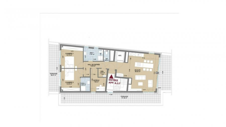 Nouvelle résidence ''SCHIEREN II'' composée de 15 appartements de haut standing répartis en 2 blocs de 4 niveaux et située à Schieren, au sein d'un village calme.Penthouse n° A.3.7 (lot 061) neuf au 3ème étage et dernier étage du Bloc B avec une surface habitable de +/- 97,73 m2 et accès direct par l'ascenseur se composant comme suit : d'un hall d'entrée, d'une cuisine à équiper ouverte sur un vaste séjour de +/- 36,63 m2 avec accès à une 1ère terrasse de +/- 57,37 m2, d'un débarras, d'un bureau (+/- 7,89 m2), d'un WC séparé, de 1 salle de douche (+/- 7,07 m2), d'une 1ère chambre +/- 13,70 m2) avec accès à une 2ème terrasse (+/- 34,67 m2), d'une 2ème chambre (+/- 13,05 m2) avec sa salle de douche (+/- 3,84 m2) et également accès à la terrasse de +/- 34,67 m2.